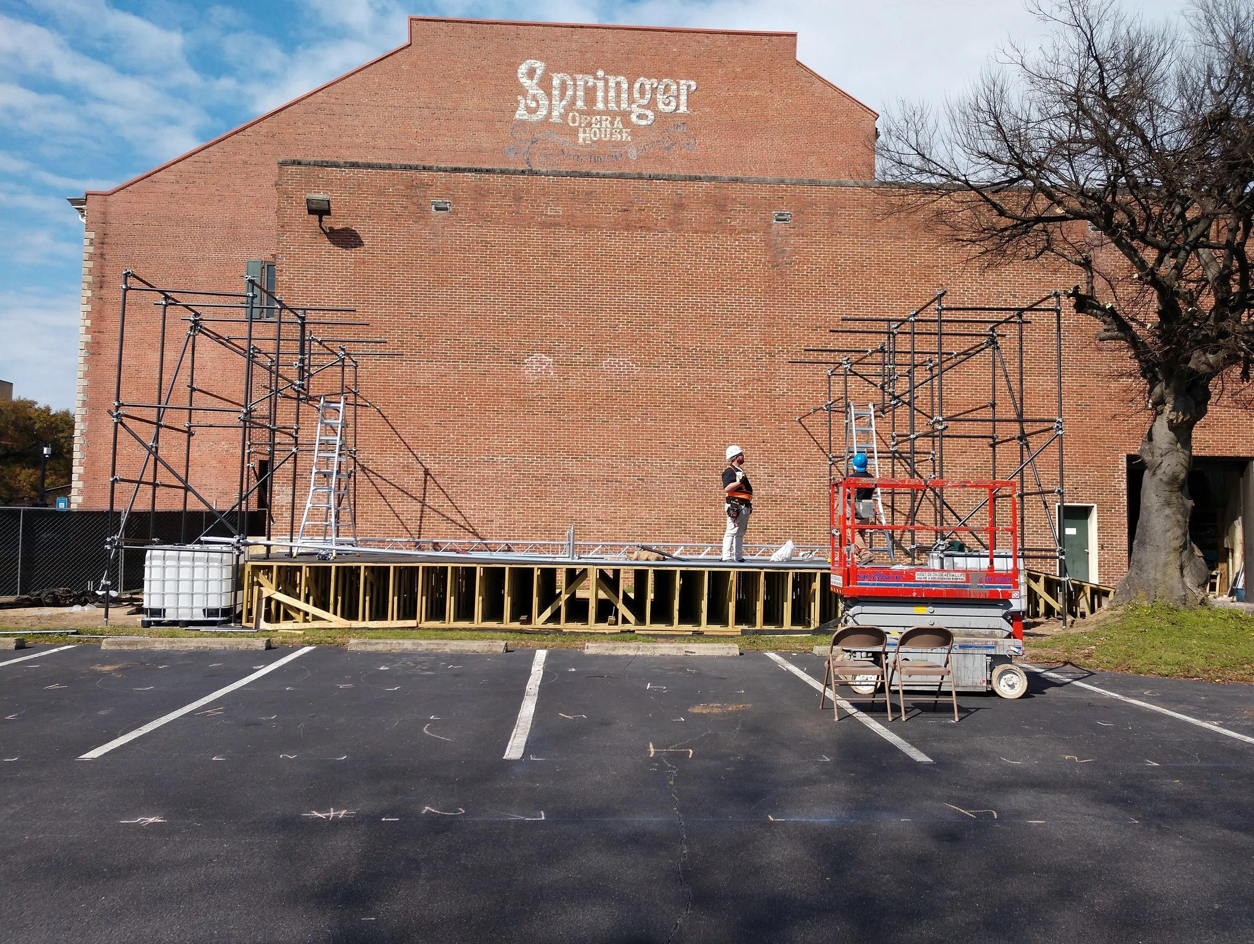 With the goal of staying open during the Covid 19 pandemic we constructed an outdoor theater and booth so the Springer Opera House could continue to produce live Theater